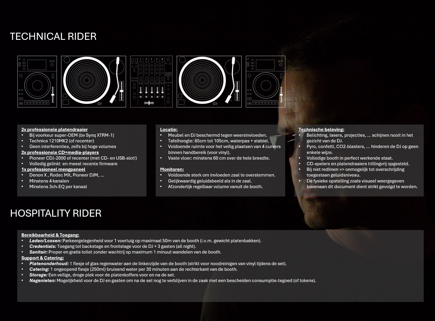 My technical and hospitality requirements are straightforward and tailored to the specific event. To keep things transparent, you can find my basic rider below as a starting point.